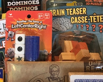 Spirit of the season gift basket. Includes yahtzee, uno, playing cards, checkers, hand held travel size activity game. With a selection of chocolate, cookies and teas as a token.